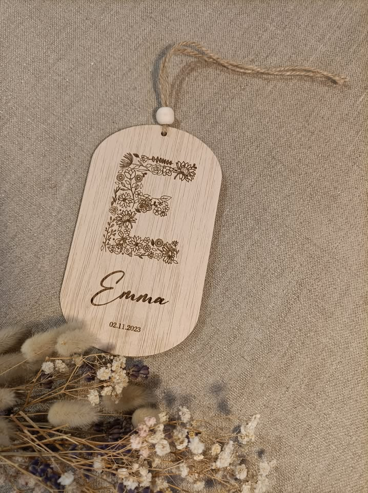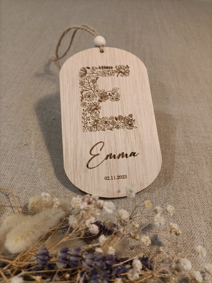 Placa de forma ovalada, de 15 x 9cm. La letra en mayúscula corresponde a la inicial del nombre. Debajo esta el nombre completa y la fecha de nacimiento.